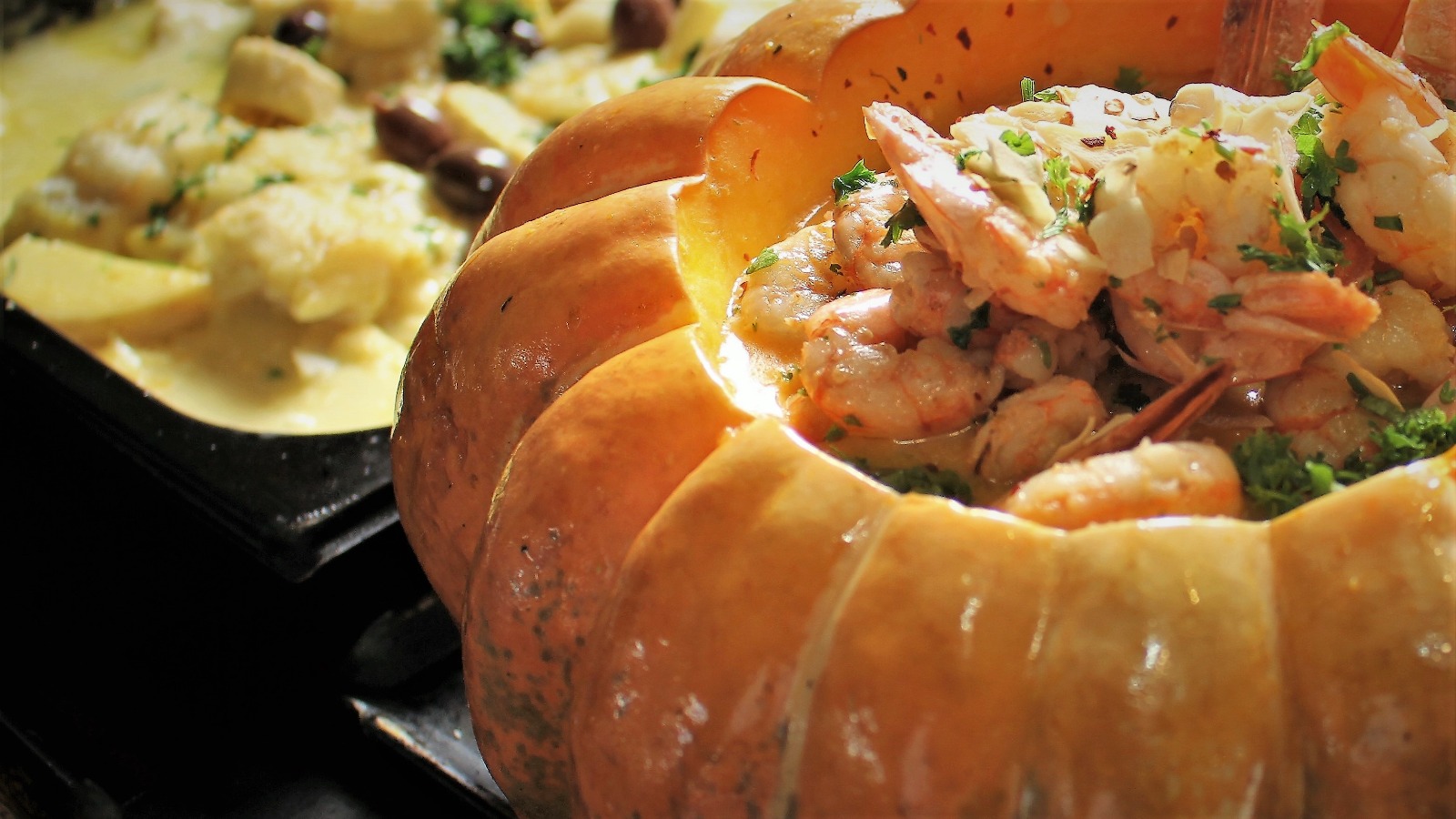 Já na ala de pratos quentes, o destaque vai para a famosa paella marinera preparada em um tacho de quase um metro de largura. Também fazem parte do cardápio pirarucu na brasa, filés de peixe, salmão grelhado, moqueca baiana, camarão na moranga, escondidinho de camarão, além de acompanhamentos como pirão, arroz, farofa de abacaxi e banana da terra com natas.