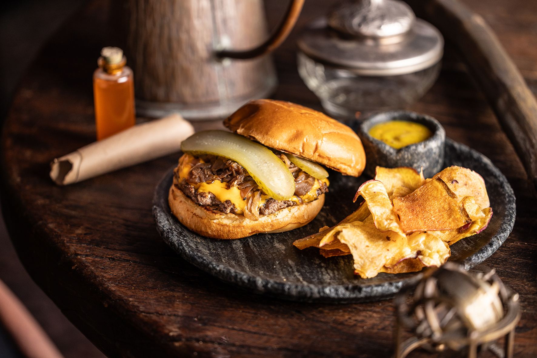 Feiticeiro Elemental: Smash 90g, cebola caramelizada, cheddar, maionese barbecue, pepino no pão brioche – R$ 42