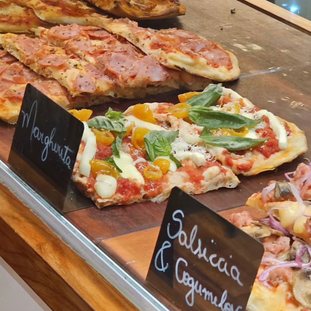 No cardápio, brilham as pizzas romanas — famosas pelo formato quadrado e vendidas em pedaços. A massa, de longa maturação, entrega leveza e crocância em cada mordida. Outro destaque são os sanduíches schiacciatas, reconhecidos pela massa crocante e pelos recheios generosos, com combinações irresistíveis como Pancetta Curada com Stracciatella e salsa de manjericão; Zucchini com creme de gorgonzola; e Presunto Cru com Stracciatella e tomatinhos cereja.