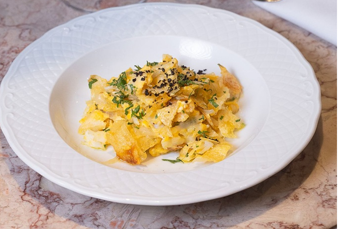 Clássico português com lascas de bacalhau, ovos, chips de batata e cebolas.