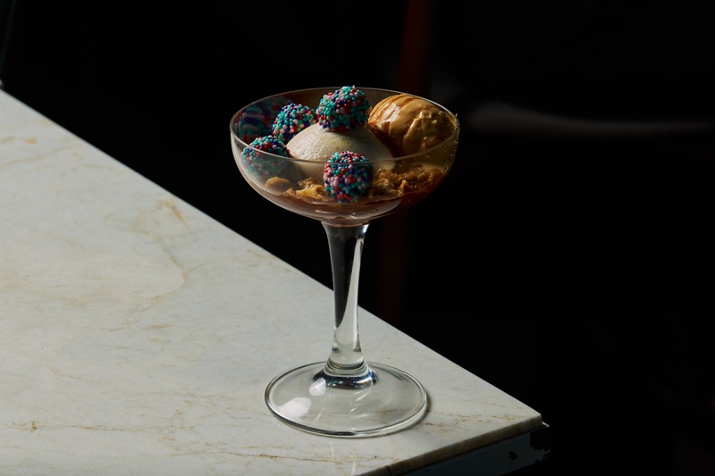 O prato combina mousse de leite de cereais, mini trufas de bolo de aniversário e sorvete de caramelo salgado (R$49), criando uma composição lúdica inspirada na criatividade da chef confeiteira Christina Tosi, conhecida por transformar lembranças afetivas em sobremesas contemporâneas.
