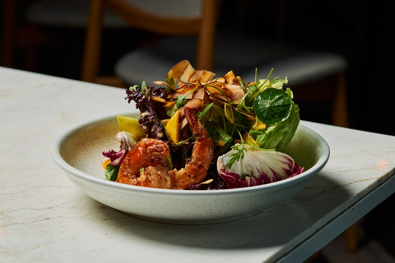 A abertura do menu destaca o frescor dos ingredientes e a delicadeza de sabores. O prato combina camarões VG com folhas frescas, manga verde, granola de castanhas e coco, finalizados com um toque cítrico (R$97).