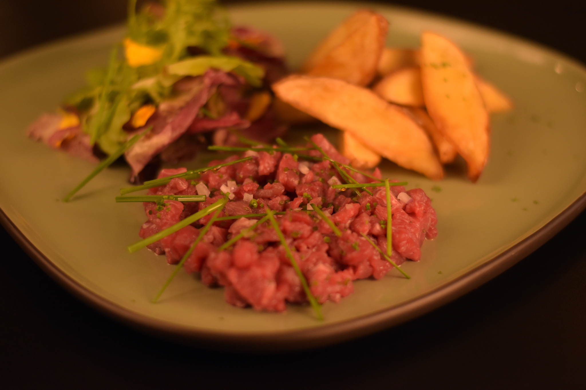 Steak tartare com batata rústica e mini salada