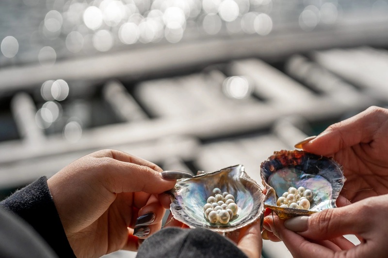 Pérolas que não atendem aos padrões da joalheria são reaproveitadas como pó rico em minerais utilizado em cosméticos, valorizado por seus benefícios para a pele e por agregar uma dimensão sustentável à produção.