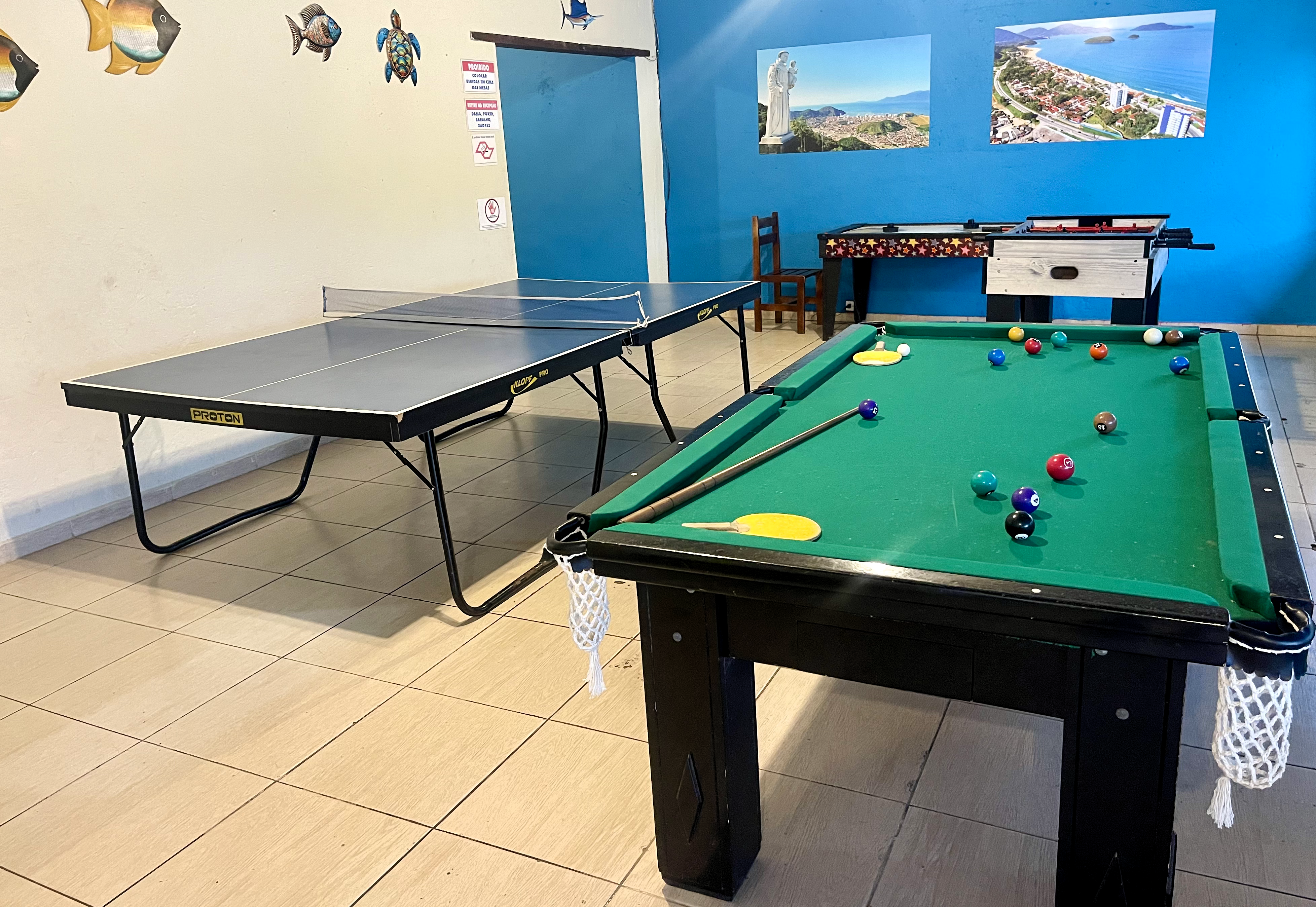 - Salão de jogos com sinuca, pebolim, ping-pong, cartas, poker, dama e até máquina de jogos, com vista para o jardim.