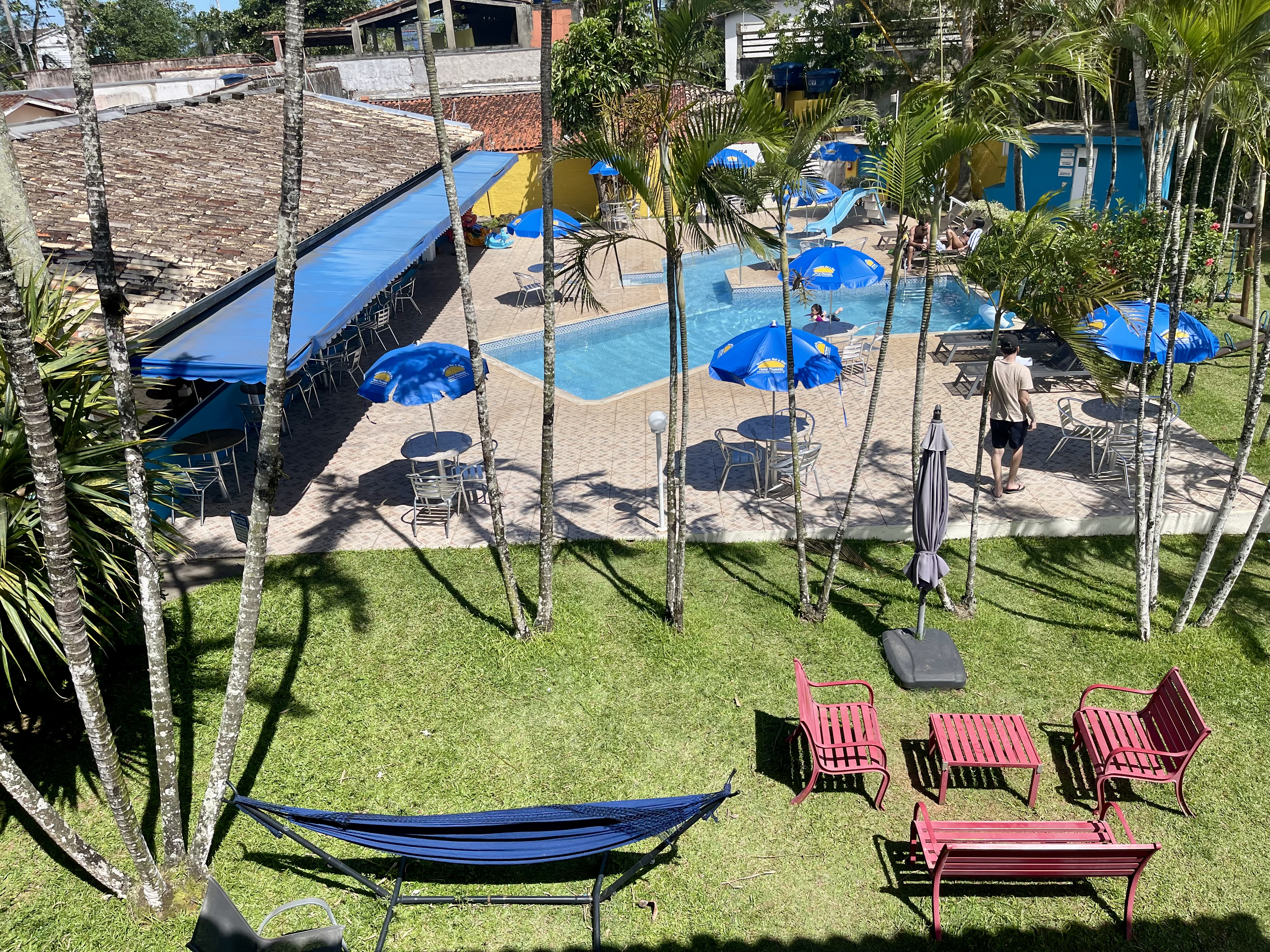 - Área verde com mesinhas, bancos e redes para descanso.