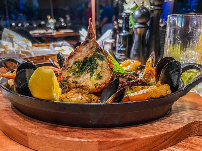 Como prato principal, a escolha foi o Frutos do Mar à Provençal (R$ 360,00), ideal para duas pessoas. A combinação reúne lagosta, polvo, camarão, lula e mexilhões, preparados com batatas, cebola e tomate-cereja. O resultado é um prato abundante, aromático e muito bem equilibrado, que respeita o sabor dos ingredientes e reforça a proposta do Baleia: comida farta, saborosa e bem apresentada.